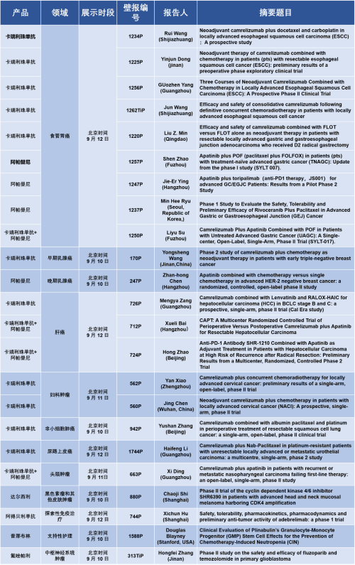 此外,在其他领域,达尔西利、氟唑帕利,以及未上市创新产品人源化抗PD-L1抗体阿得贝利单抗、微管蛋白抑制剂普那布林等产品相关研究入选了4篇壁报,下表为具体壁报编号及展示时间,让918搏天堂一起相约,见证多项研究成果公布。